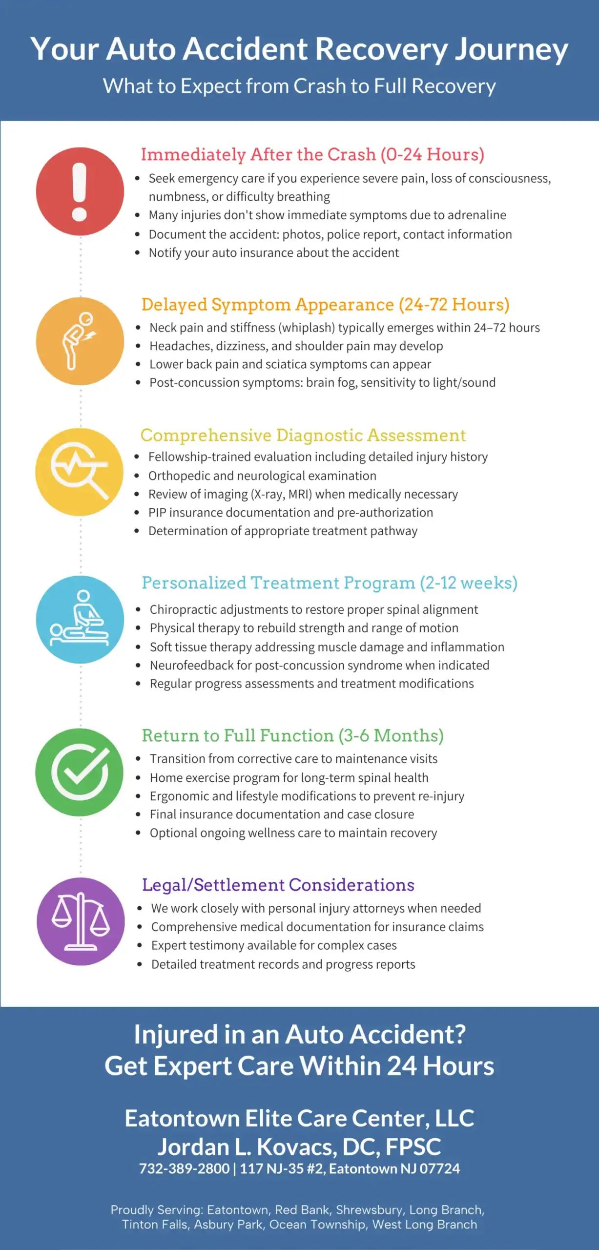 Understanding what happens after an auto accident helps patients make informed decisions about their care. The following timeline shows the typical progression of auto accident injuries and the comprehensive treatment process we provide at Eatontown Elite Care Center. Dr. Jordan Kovacs’s fellowship training in Primary Spine Care ensures accurate diagnosis and appropriate treatment planning throughout each phase of recovery.